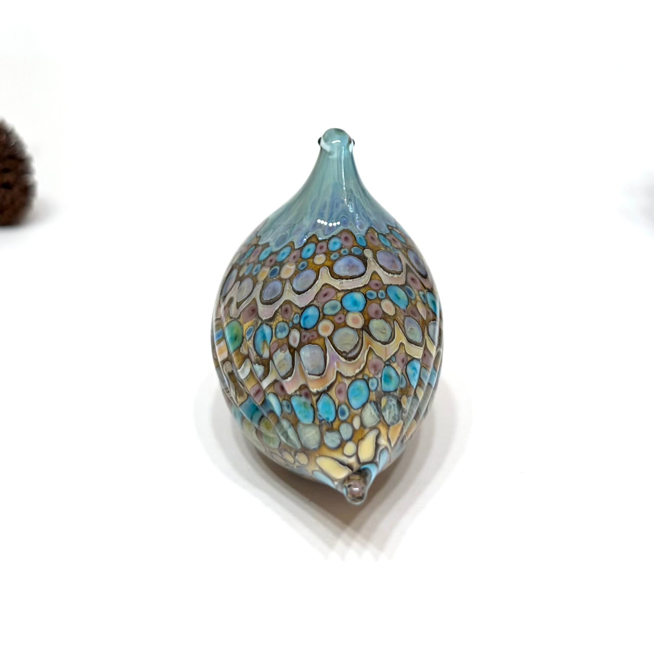 模様部分は猫のヒゲほどの細いガラス棒を先端から少しずつ炎の上で溶かしつけています。